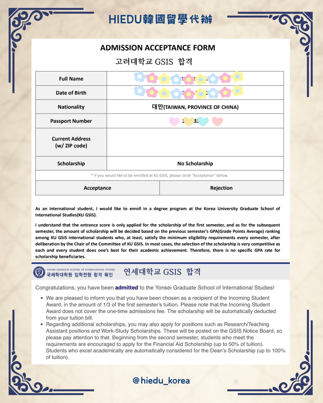 🎉 我們的學生在本次申請中,同時獲得「高麗大學 GSIS」與「延世大學 GSIS」雙校錄取!